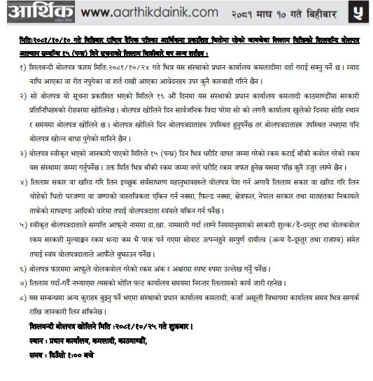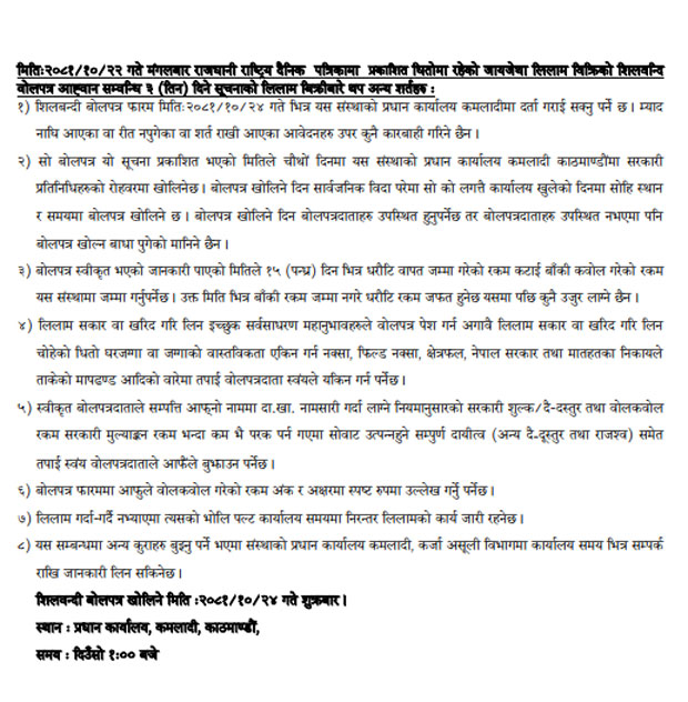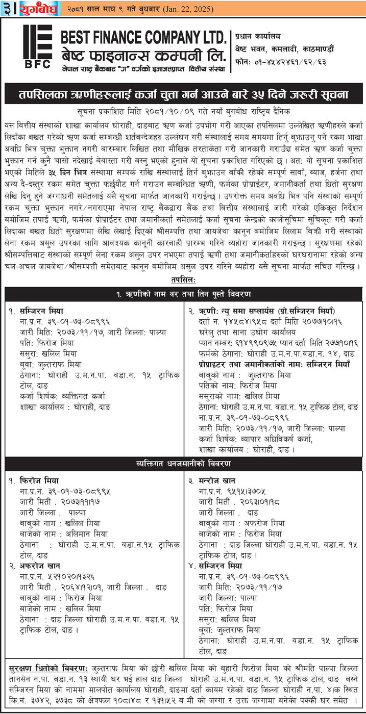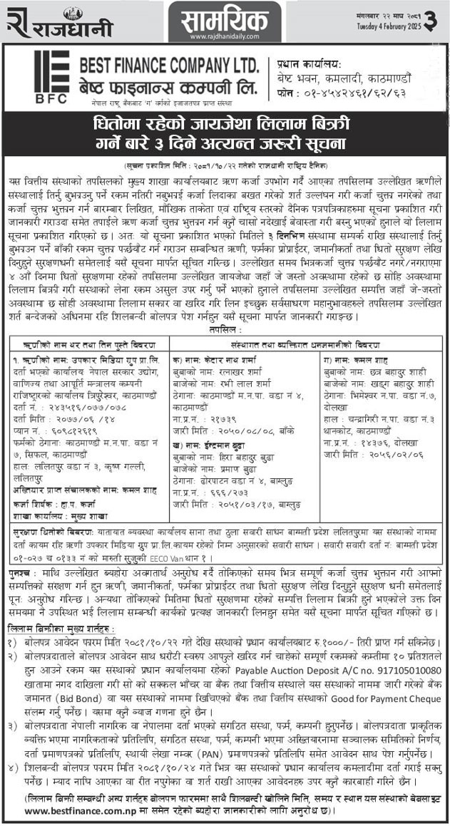 धितोमा रहेको जायजेथा लिलाम बिक्री गर्नेबारे ३ दिने अत्यन्त जरुरी सूचना (Published in Rajdhani National Daily)