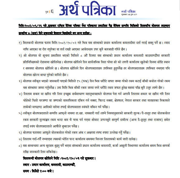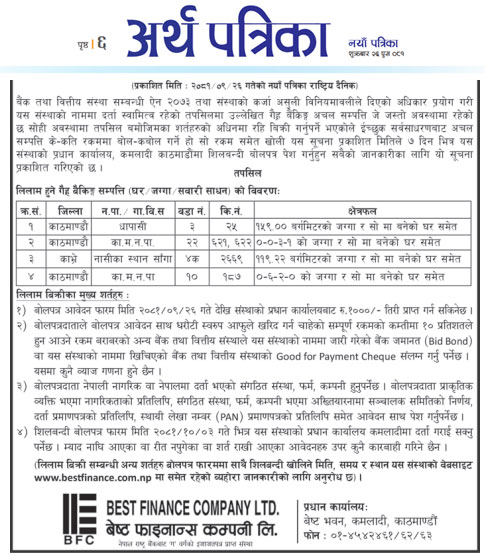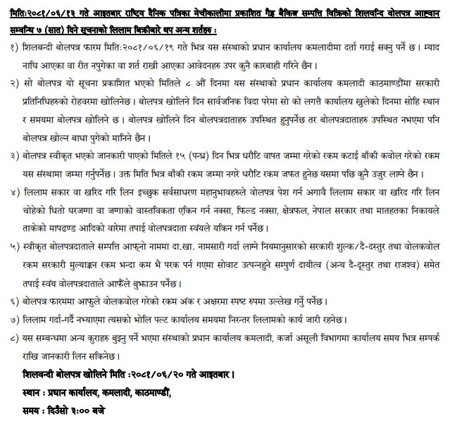 Terms and conditions on 7 days NBA auction notice as published on National Daily ‘Arthik’ on 2081-09-26