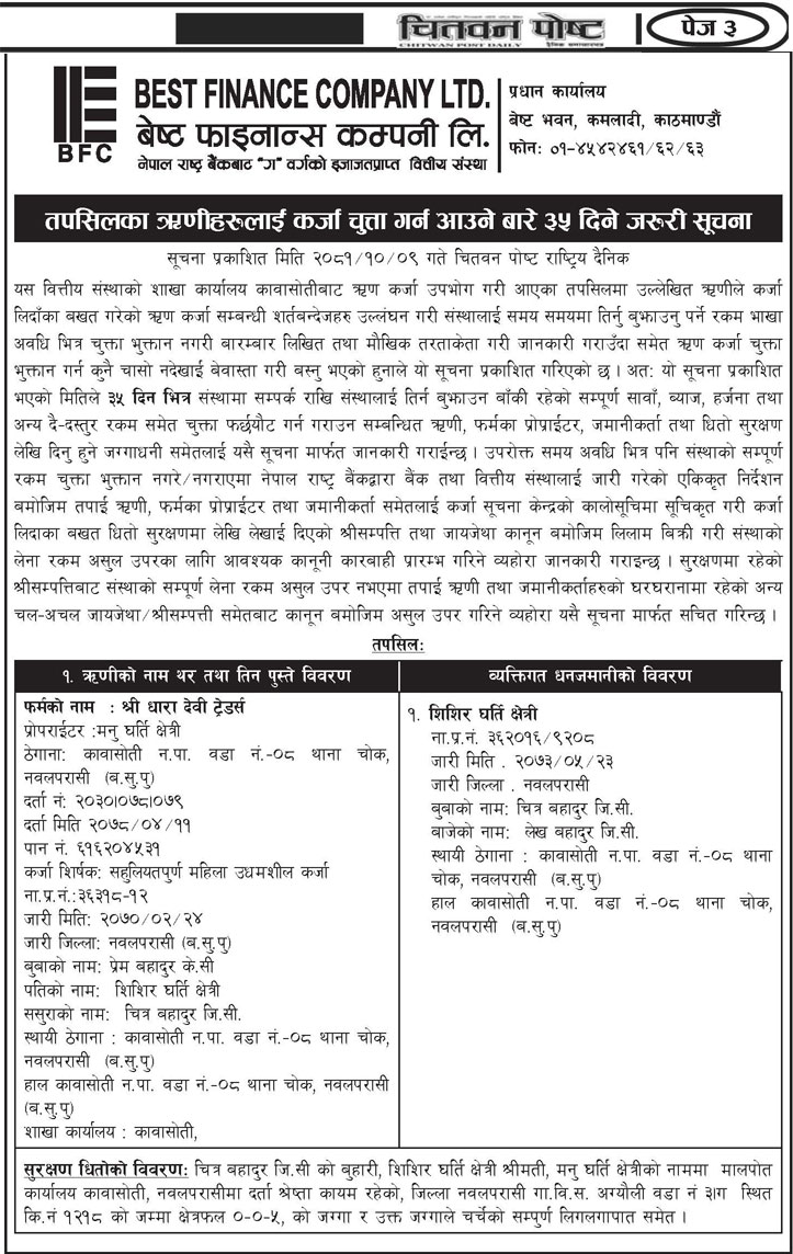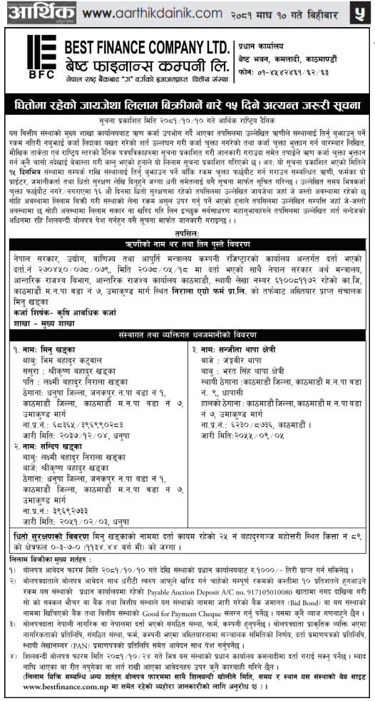 धितोमा रहेको जायजेथा लिलाम बिक्री गर्नेबारे ३ दिने अत्यन्त जरुरी सूचनाको अन्य शर्तहरु (Published in Arthik Dainik)