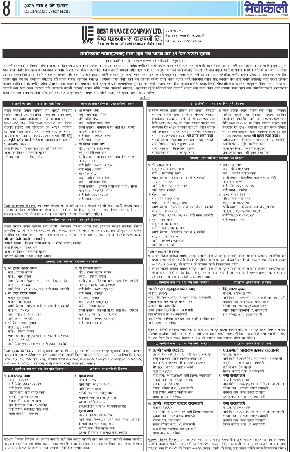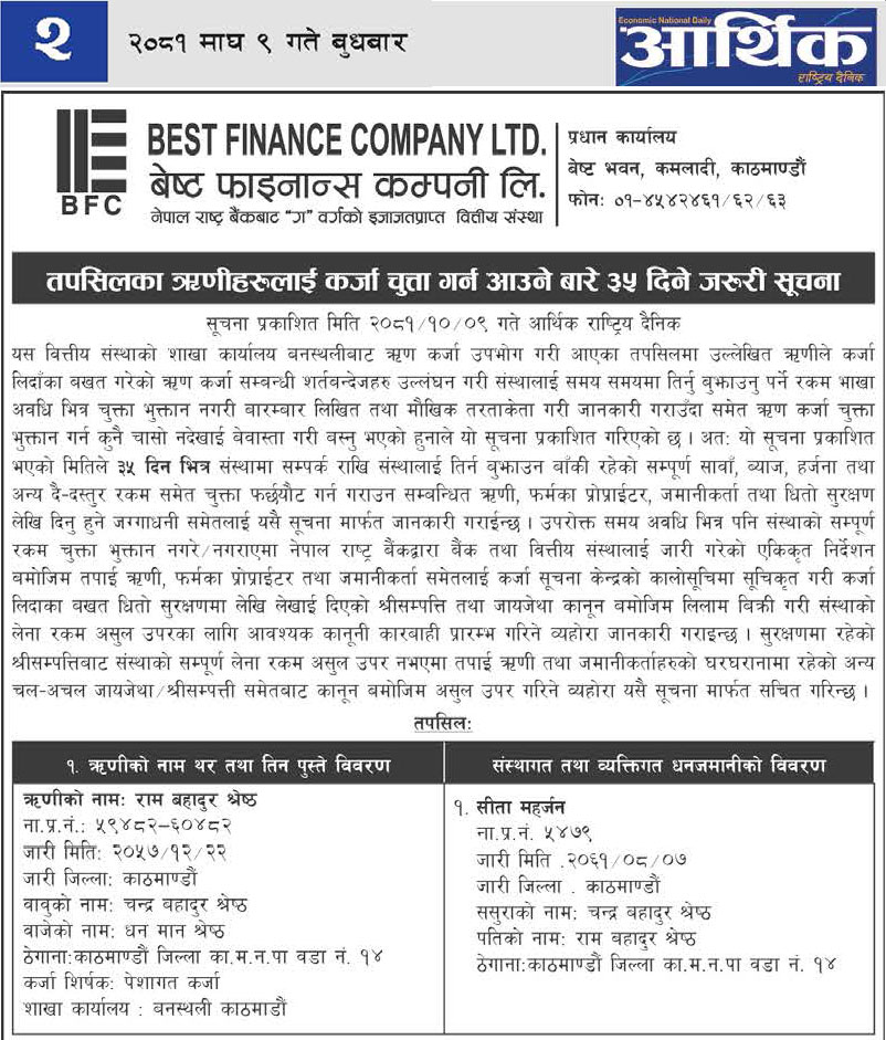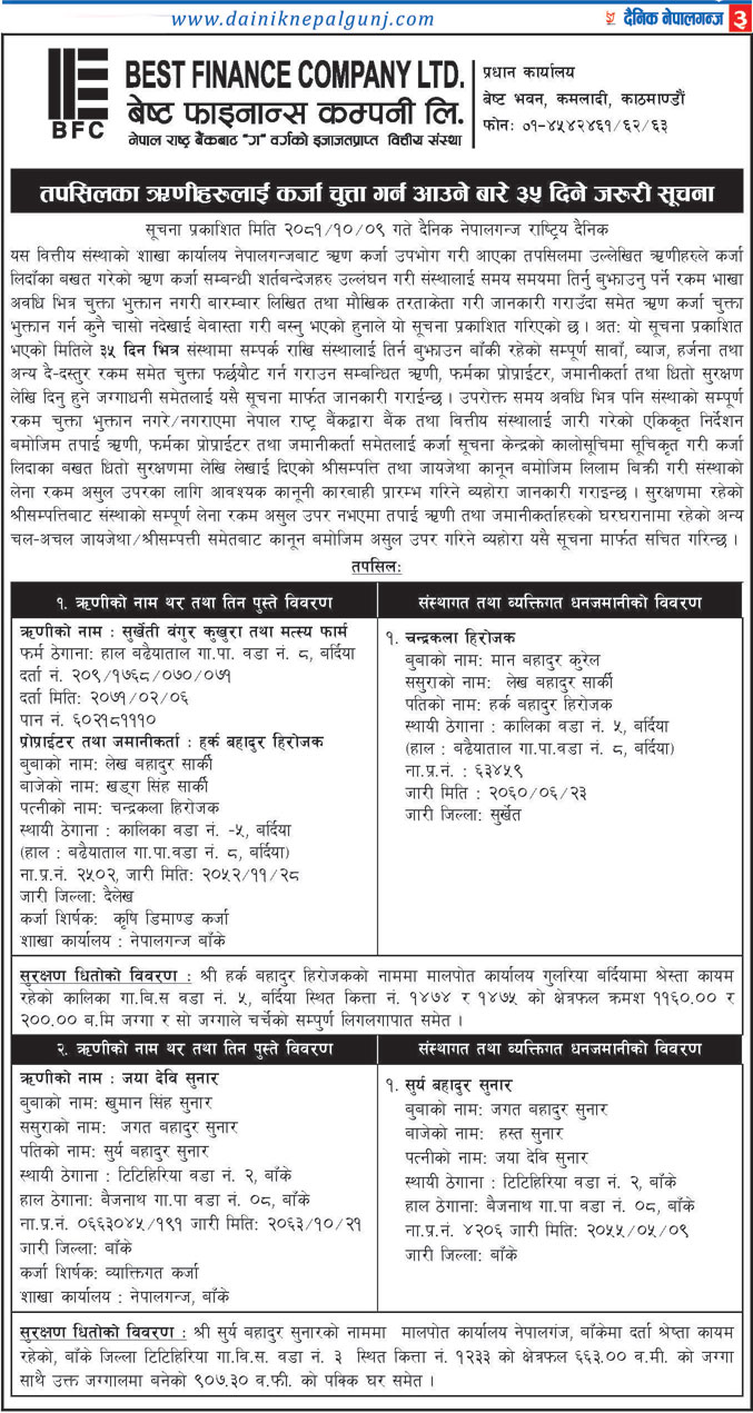कर्जा चुक्ता गर्न आउने बारे ३५ दिने सुचना