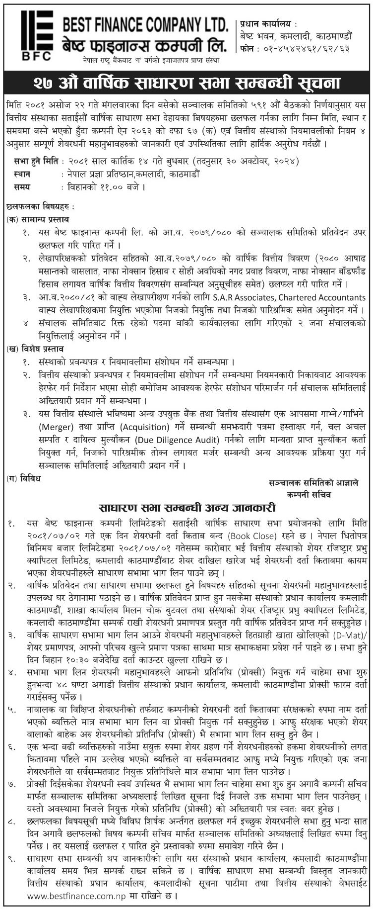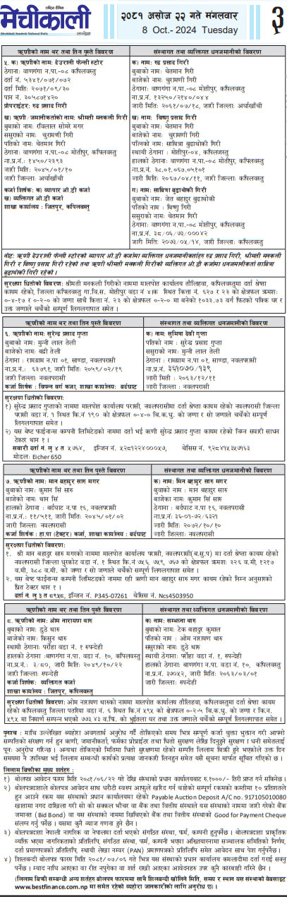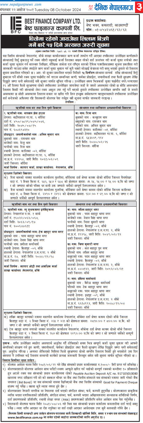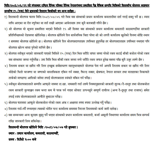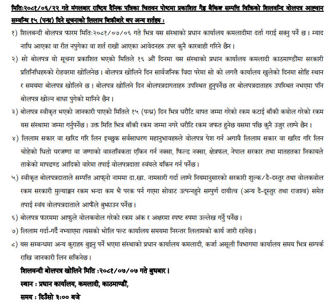 २०८१-०६-२२ गते मंगलबार राष्ट्रिय दैनिक पत्रिका दैनिक नेपालमा प्रकाशित धितोमा रहेको जायजेथा लिलाम बिक्री गर्नेबारे १५ दिने अत्यन्त जरुरी सूचनाका थप अन्य शर्तहरु