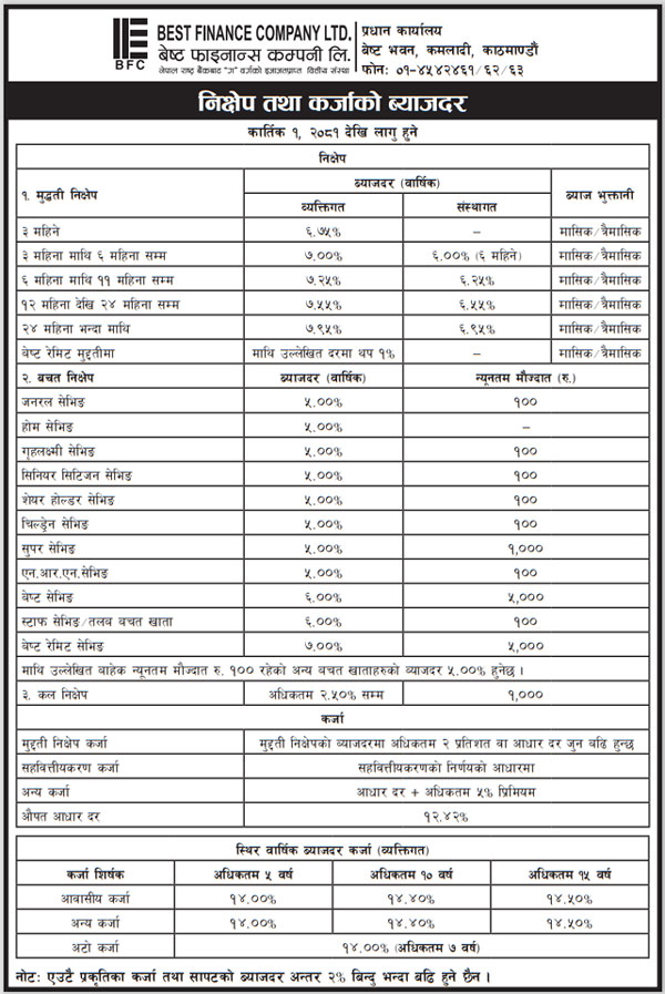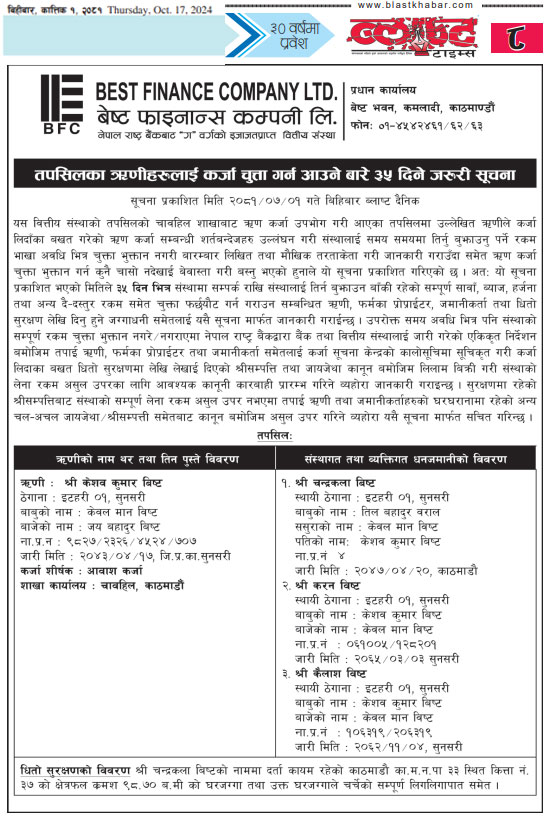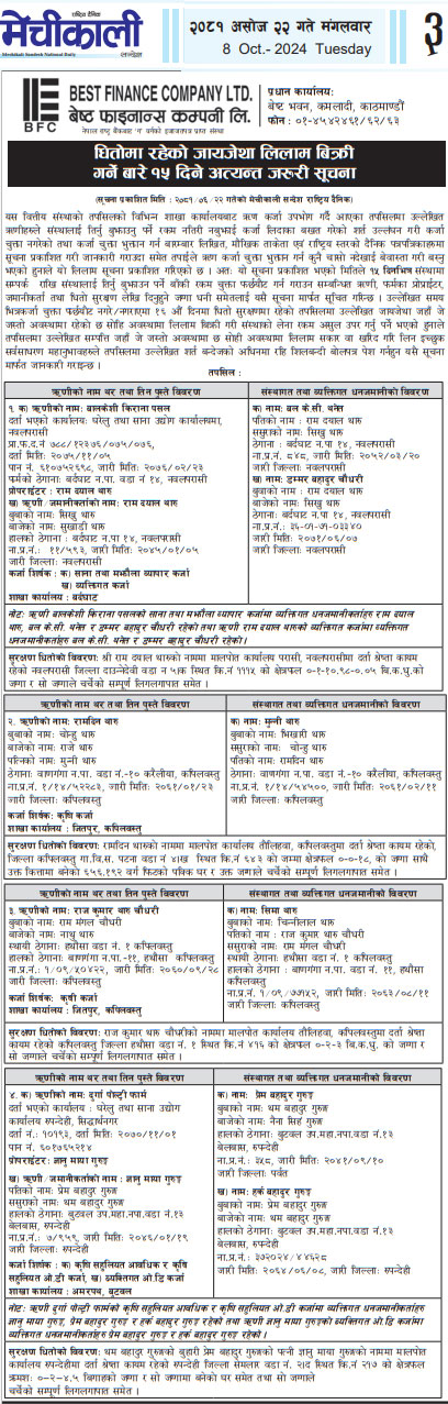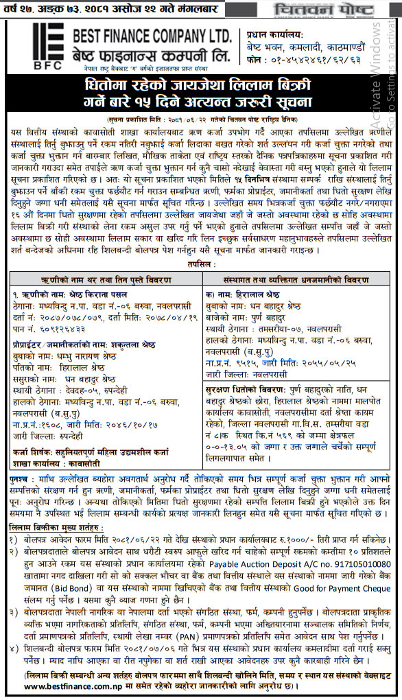 २०८१-०६-२२ गते मंगलबार राष्ट्रिय दैनिक पत्रिका दैनिक नेपालमा प्रकाशित धितोमा रहेको जायजेथा लिलाम बिक्री गर्नेबारे १५ दिने अत्यन्त जरुरी सूचना