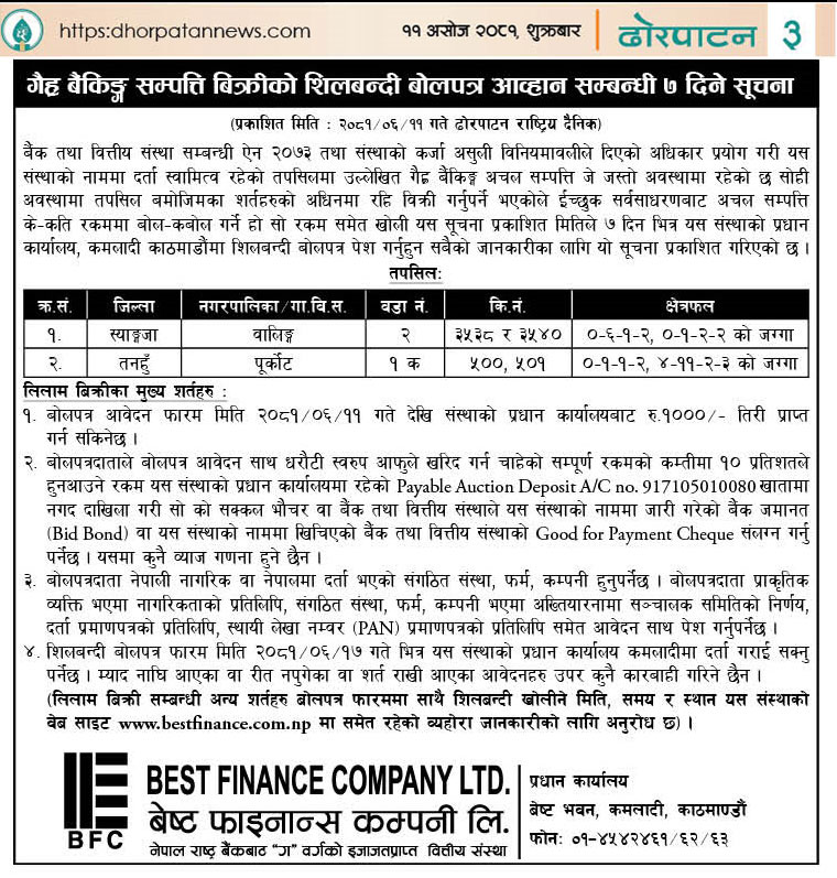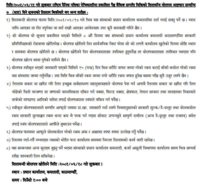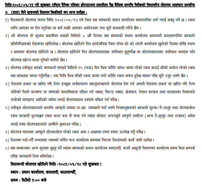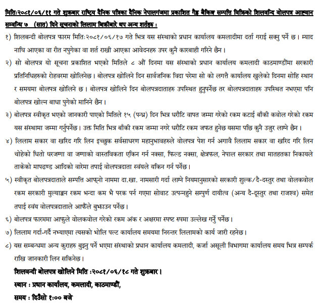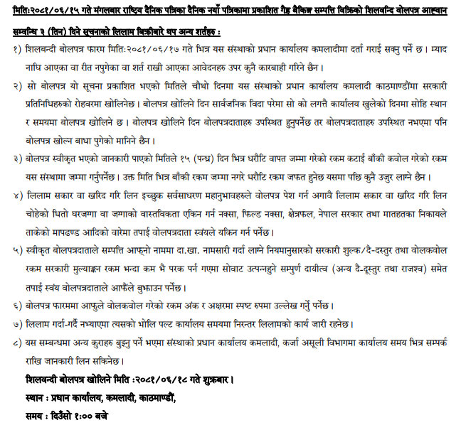 २०८१-०६-१५ गते मंगलबार राष्ट्रिय दैनिक पत्रिका दैनिक नया¤ पत्रिकामा प्रकाशित गैह्र बैकिङ्ग सम्पत्ति विक्रिको शिलवन्दि वोलपत्र आह्वान सम्वन्धि ३ (तिन) दिने सूचनाका थप अन्य शर्तहरु
