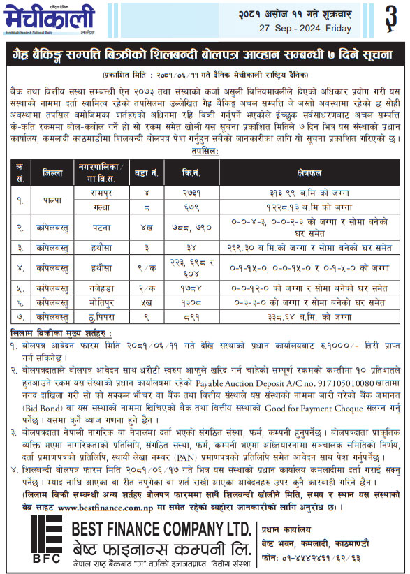 २०८१-०६-१३ गते राष्ट्रिय दैनिक पत्रिका मेचीकालीमा प्रकाशित गैह्र बैकिङ्ग सम्पत्ति विक्रिको शिलवन्दि वोलपत्र आह्वान सम्वन्धि ७ (सात) दिने सूचनाको लिलाम बिक्रीबारे
