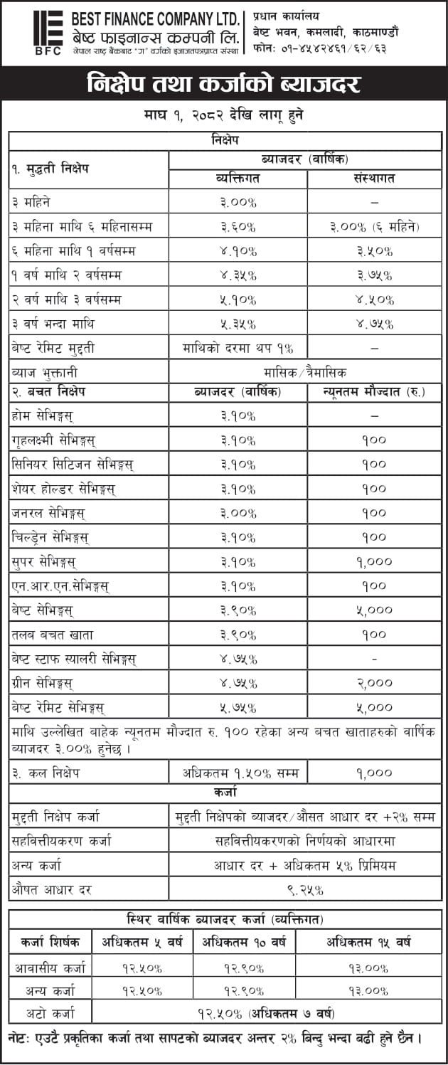 माघ १, २०८२ देखि लागू हुने ब्याजदरहरू
