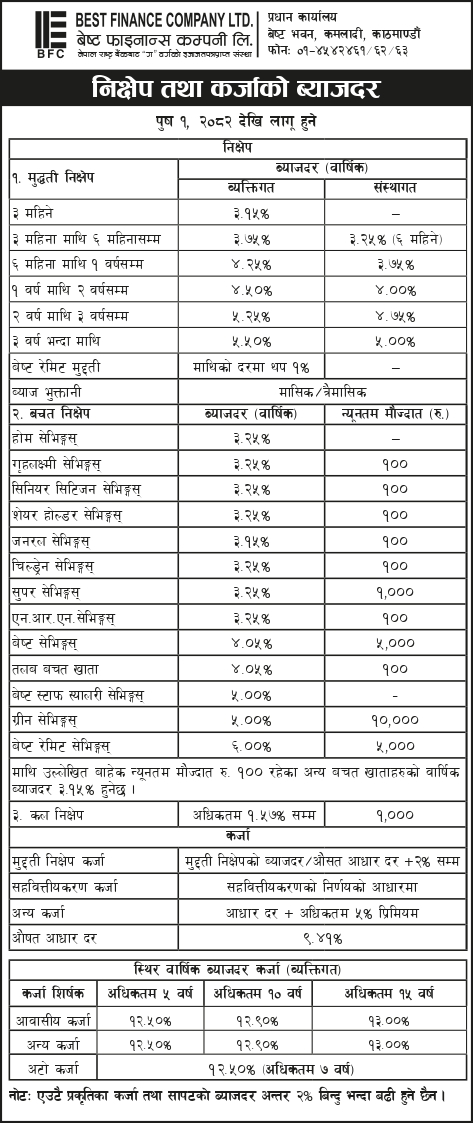 पुष १, २०८२ देखि लागू हुने ब्याजदरहरू