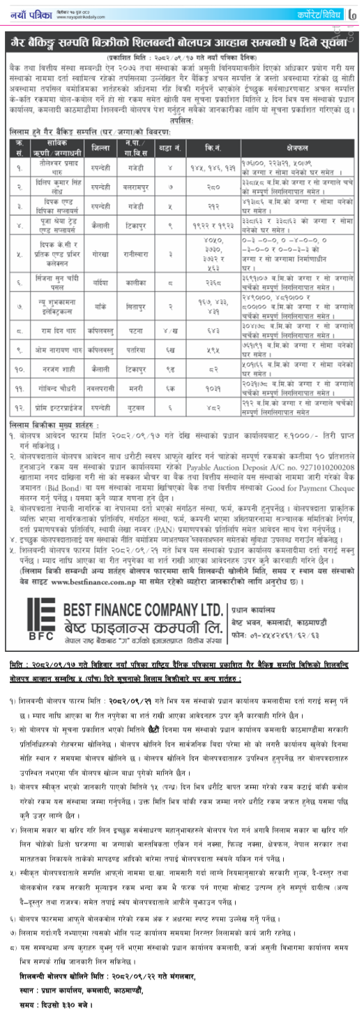 गैर बैकिङ्ग सम्पति बिक्रिको शिलबन्दी बोलपत्र आव्हान सम्बन्धी ५ दिने सूचना