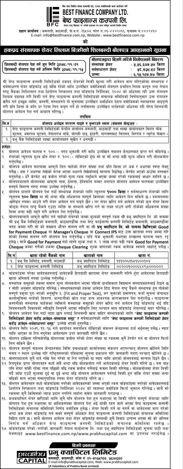 Auction Open Notice of Right Promoter Share of Best Finance Company Ltd.